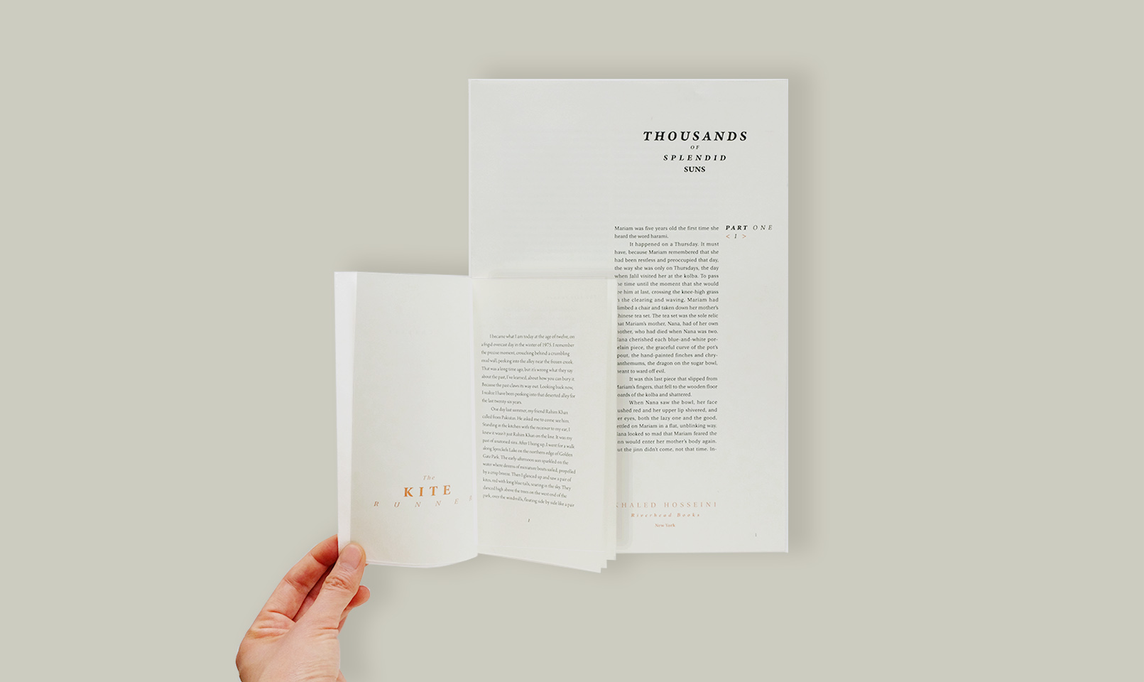 The first part of this book starts from the kite runner, which is a small format and classical layout; With the development of the main characters get to know each other, the second part of this book changes format with both novels, the kite runner and A Thousand Splendid Suns. The layout design is in a more separated way and continue the physical restrict from the small physical format; Along with the main character’s fate interact with each other and the conflict with social and cultural background, the third part of this book is the two layouts influenced with each other and no longer be extended the restriction from the physical format before. The common key words of one novel is highlighted by the second one’s font and line-space.